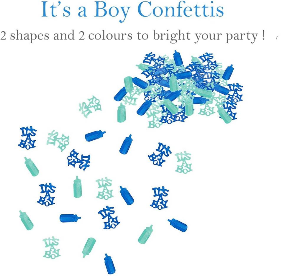 - 1× pachet de confetti în nuanțe de albastru și turcoaz cu motive de biberon și inscripția „It’s a Boy”.