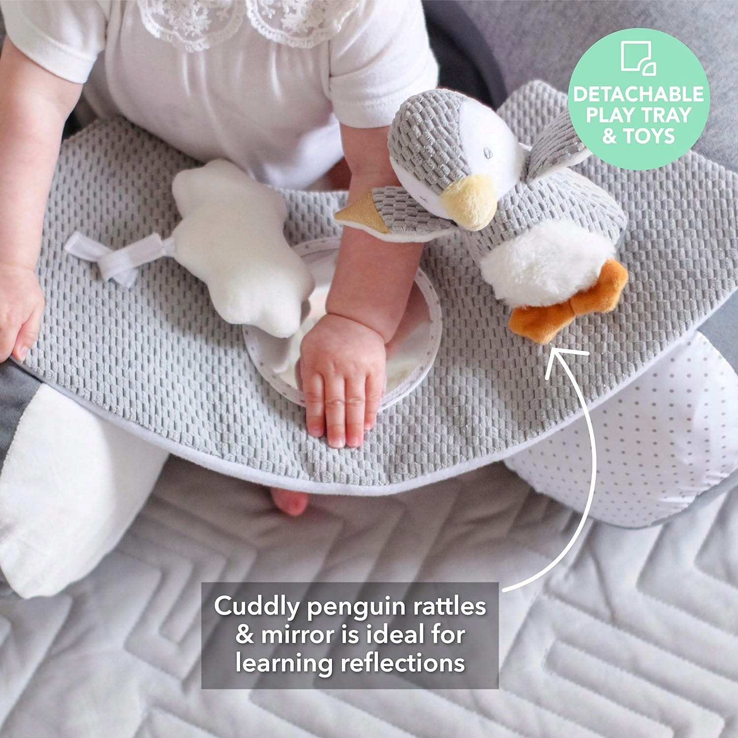 - Jucării pentru copii – tavă detașabilă cu jucării interactive, inclusiv un pinguin de pluș care zornăie, un nor moale și o oglindă pentru învățarea reflexiei.